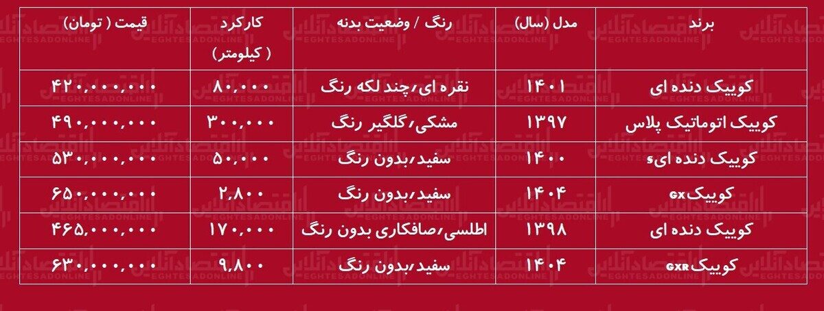 به گزارش خبرنگار صنعت مالی، بر اساس آگهیهای کوییک کارکرده، قیمت کوییک دندهای مدل ۱۴۰۱ با کارکرد ۸۰ هزار کیلومتر و چند لکه رنگ، در بازار امروز ۴۲۰ میلیون تومان اعلام شد. این نسخه از کوییک بهعنوان یکی از پرفروشترین مدلهای کارکرده، همچنان خریداران زیادی را به دلیل مصرف سوخت پایین و هزینه نگهداری مناسب به خود جذب میکند.