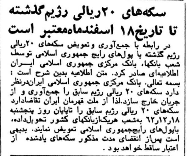 به گزارش خبرآنلاین به نقل از اطلاعات آنلاین، بانک مرکزی در اسفند ماه ۴۰ سال پیش از انقضای اعتبار سکههای دو تومانی خبر داد. روزنامه اطلاعات اول اسفند ۱۳۶۲ به نقل از بانک مرکزی نوشت که ۱۸ اسفند آخرین روز حیات این سکهها در جیب مردم است. خبر را بخوانید و عکسی از این سکههای به تاریخ پیوسته را تماشا کنید.