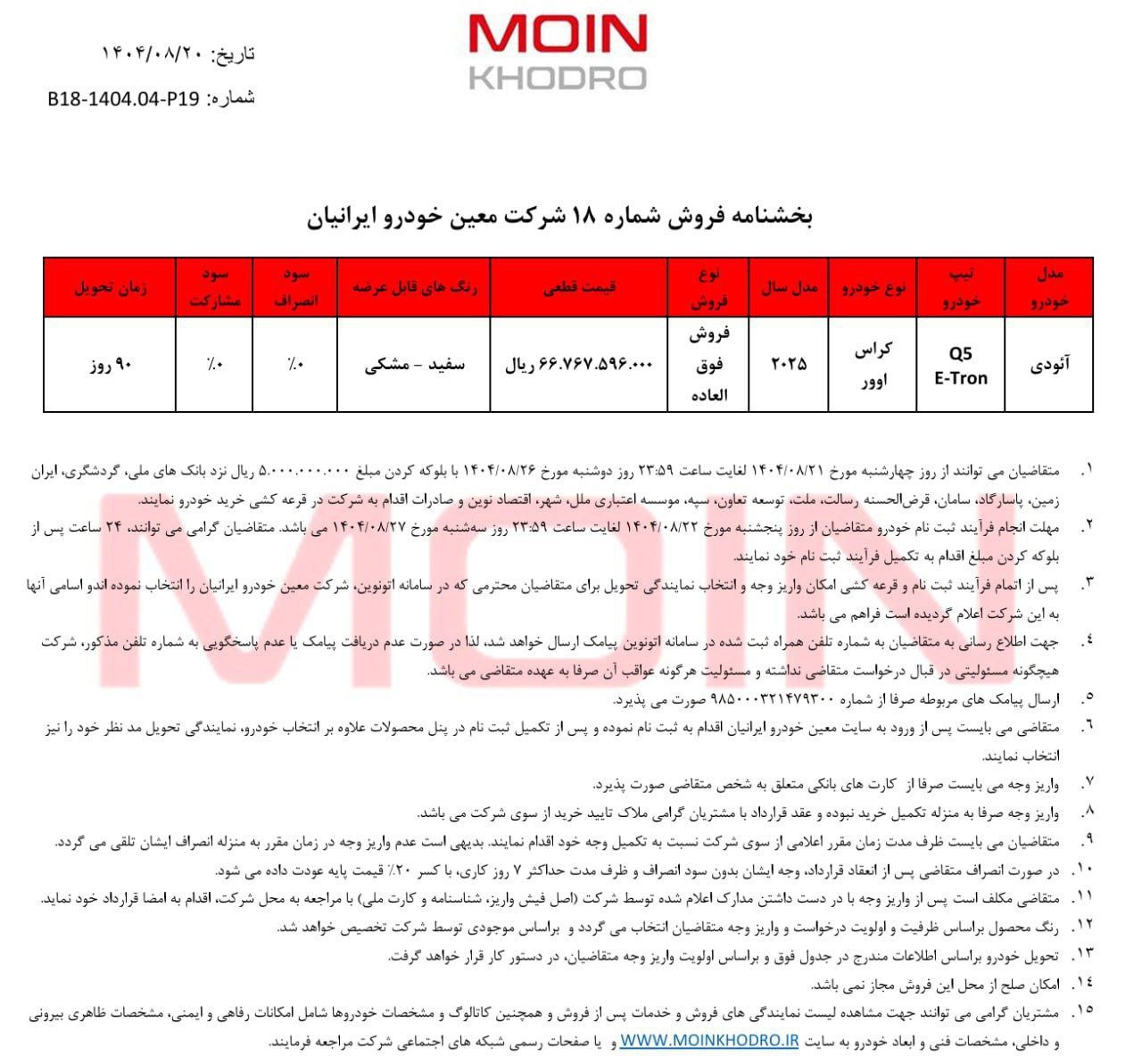 به گزارش صنعت مالی ،شرکت معین خودرو ایرانیان در اقدامی قابل توجه، با انتشار دو بخشنامه فروش مجزا، از آغاز عرضه دو کراس‌اوور تمام برقی لوکس از برند آئودی خبر داد. این دو محصول، آئودی Q4 E-Tron و آئودی Q5 E-Tron، هر دو با مدل سال ۲۰۲۵ و در قالب فروش فوق‌العاده از طریق سامانه یکپارچه (اتونوین) به بازار عرضه خواهند شد.