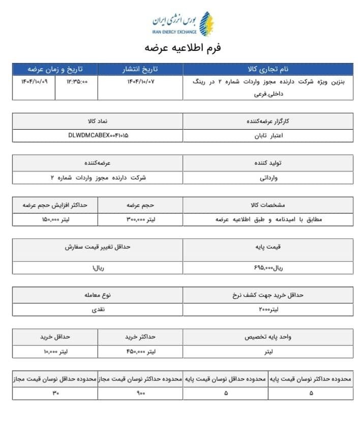 اما روز گذشته، دومین عرضه بنزین ویژه در بورس انرژی، با اطلاعیه‌ای که صادر شد، ابهاماتی را به همراه داشت. در اطلاعیه روز گذشته نرخ هر لیتر بنزین سوپر وارداتی، با قیمت پایه 69500 تومان اعلام شد. یعنی 3700 تومان در هر لیتر، افزایش قیمت پایه در عرضه دوم !