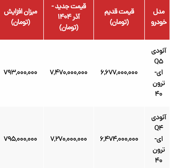 بر اساس بخشنامه صادر شده ویژه آذرماه ۱۴۰۴، دو خودروی آئودی Q5 ای-ترون 40 و آئودی Q4 ای-ترون 40 مشمول اصلاحیه قیمت شدهاند.