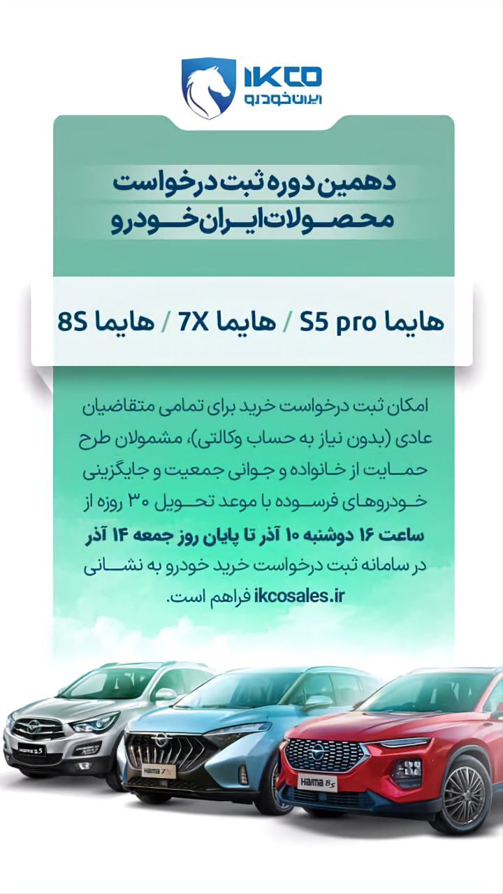 به گزارش صنعت مالی، دهمین دوره ثبت درخواست خرید محصولات گروه صنعتی ایرانخودرو با موعد تحویل ۳۰ روزه، از ساعت ۱۶ روز دوشنبه ۱۰ آذرماه ۱۴۰۴ آغاز شده و تا پایان روز جمعه ۱۴ آذرماه ادامه خواهد داشت.