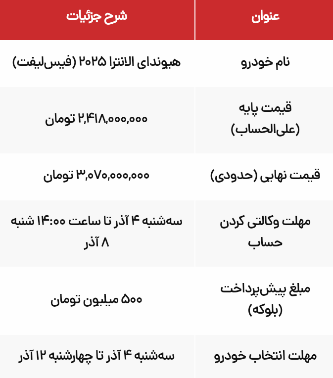 در این طرح فروش، قیمت پایه (علیالحساب) هیوندای الانترا ۲۰۲۵ در مبادی ورودی معادل ۲ میلیارد و ۴۱۸ میلیون تومان اعلام شدهاست.