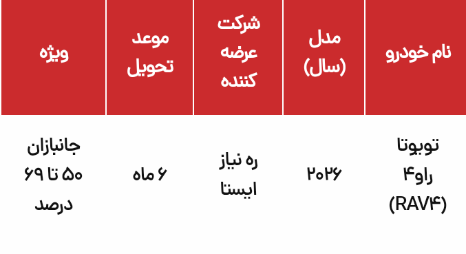 شرکت واردکننده ره‌نیاز ایستا طی اطلاعیه‌ای جزئیات فروش تویوتا راو۴ مدل ۲۰۲۶ را منتشر کرده است.