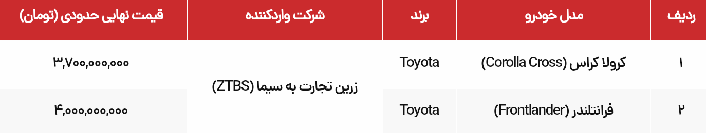بر اساس اطلاعات منتشر شده، دو خودروی کرولا کراس و فرانتلندر در روزهای آینده در دسترس متقاضیان قرار خواهند گرفت و قیمت نهایی حدودی آنها نیز به صورت رسمی اعلام شدهاست.