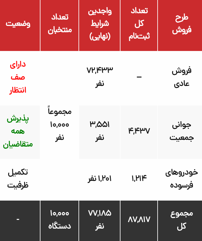 بر اساس توضیحات ارائه شده، در دومین طرح پیشفروش مشارکت در تولید پارس نوا، مجموعاً ۸۷ هزار و ۸۱۷ نفر اقدام به ثبتنام اولیه کردند. پس از پایش اطلاعات و بررسی شروط قانونی (مانند عدم پلاک فعال، داشتن گواهینامه و…)، تعداد ۷۷ هزار و ۱۸۵ نفر واجد شرایط نهایی (Eligible) برای شرکت در فرآیند قرعهکشی شناخته شدند. این ارقام نشان میدهد که تصویرسازیهای انجام شده مبنی بر شکست طرح فروش ناشی از برداشت نادرست از آمار تفکیکی (بهویژه بخش جوانی جمعیت) بوده است.