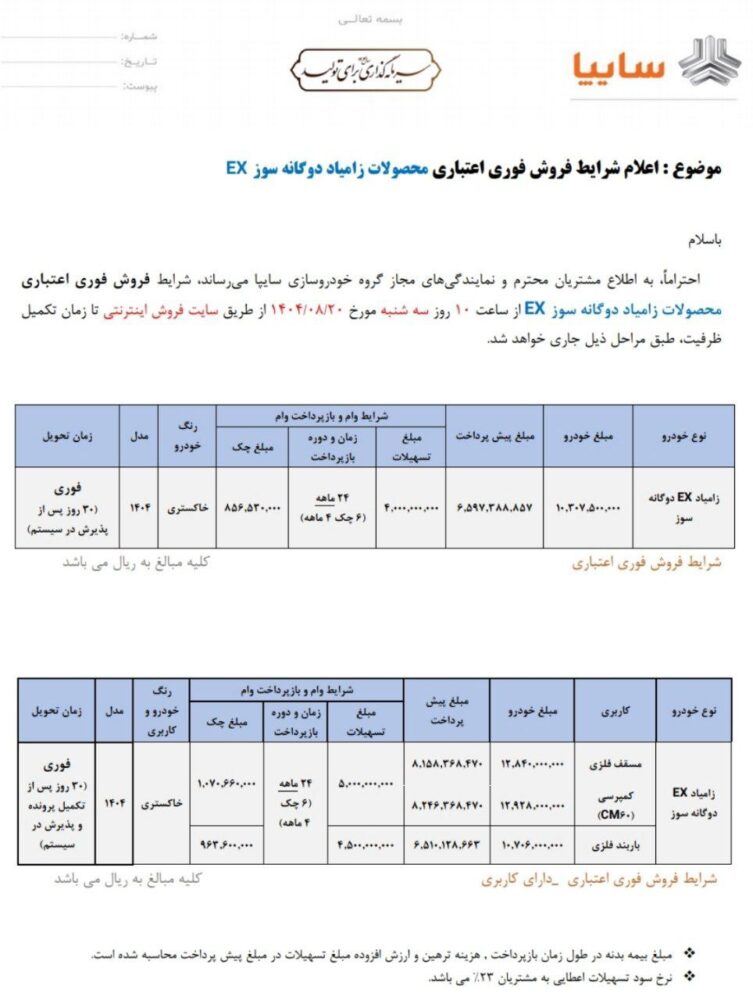 متقاضیان می‌توانند از ساعت 10 صبح روز سه‌شنبه 20 آبان‌ماه از طریق سایت فروش سایپا نسبت به ثبت‌نام اقدام کنند. زامیاد EX نمونه بروزرسانی شده وانت نیسان معروف است که پس از چالش‌های فراوان با سازمان استاندارد، توسط این شرکت توسعه یافته است.