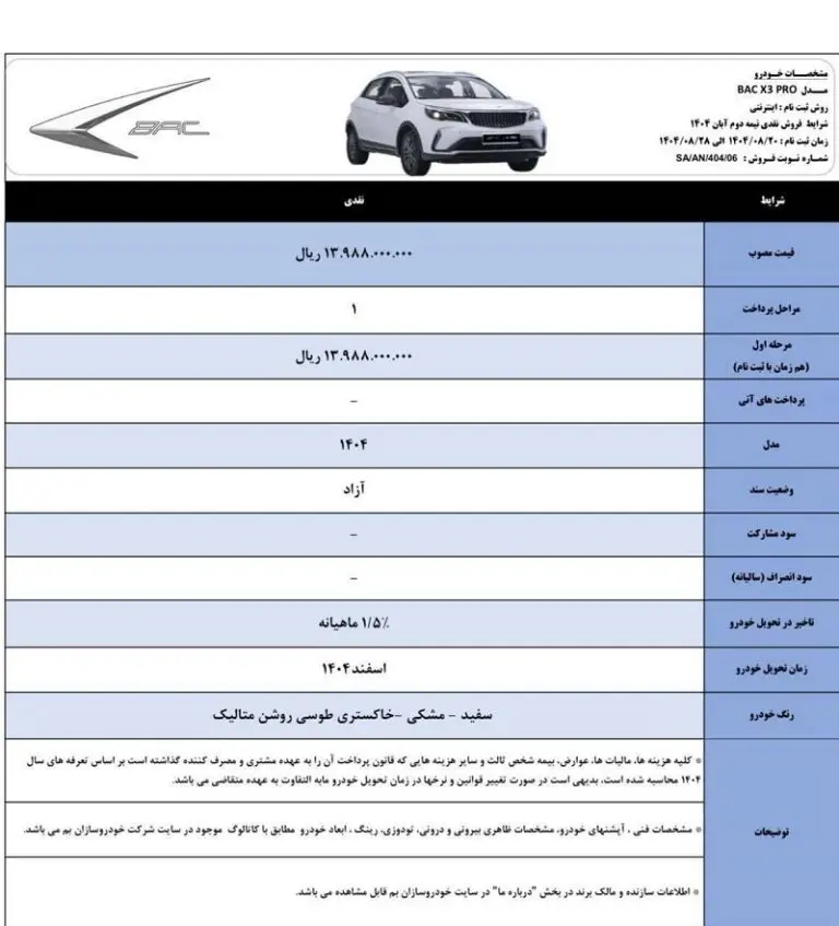 قیمت بک ایکس ۳ پرو در این طرح، ۱ میلیارد و ۳۹۸ میلیون و ۸۰۰ هزار تومان اعلام شده که به صورت نقدی باید پرداخت گردد. مدل خودروها ۱۴۰۴ بوده و نرخ جریمه تأخیر در تحویل به صورت ماهانه ۱.۵ درصد محاسبه خواهد شد.