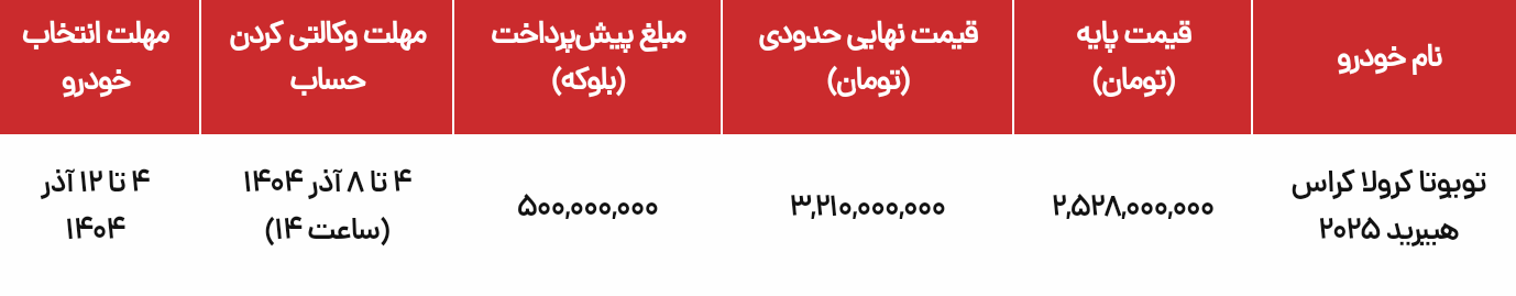 بر اساس اطلاعیه رسمی منتشر شده، فرآیند ثبت‌نام و عرضه این خودروی هیبریدی ژاپنی در آذرماه ۱۴۰۴ کلید خورده‌است. این رویداد فرصتی تازه برای مصرف‌کنندگان ایرانی است تا به یکی از پرفروش‌ترین کراس‌اوورهای بازار جهانی دسترسی پیدا کنند؛ خودرویی که از زمان معرفی در سال ۲۰۲۰ تاکنون، فروشی بالغ بر یک میلیون دستگاه را در ۱۴ کشور و بازارهای اروپایی تجربه کرده‌است.