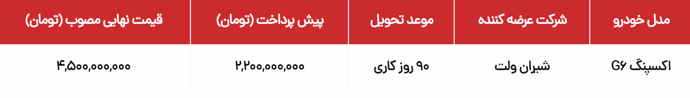 در حالی که تب خودروهای برقی لوکس و هوشمند در جهان بالا گرفته، شرکت «شیران ولت» به عنوان یکی از متولیان جدید واردات خودروهای انرژی پاک، جزئیات قیمتی یکی از موردانتظارترین محصولات خود، یعنی اکسپنگ G6 را اعلام کرد.