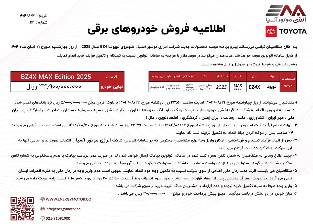 با آغاز فروش تویوتا BZ4X مدل ۲۰۲۵ در سامانه یکپارچه خودروهای برقی و با قیمت قطعی، گام جدیدی در توسعه بازار خودروهای برقی در کشور برداشته شد.