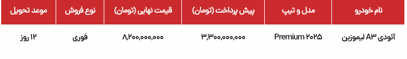 شرکت نادین خودرو فروش فوری آئودی A3 لیموزین ۲۰۲۵ را با تحویل کوتاه‌مدت ۱۲ روزه آغاز کرد.