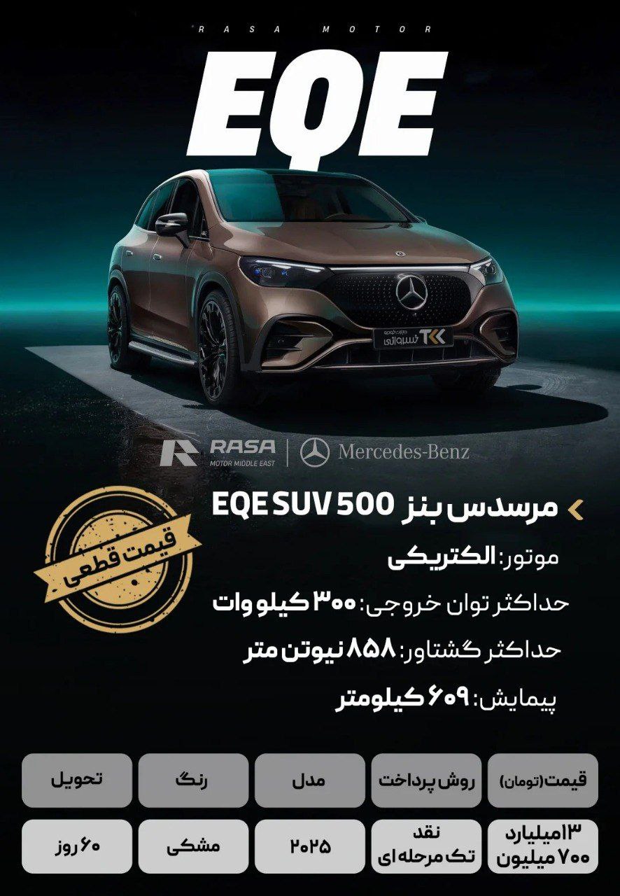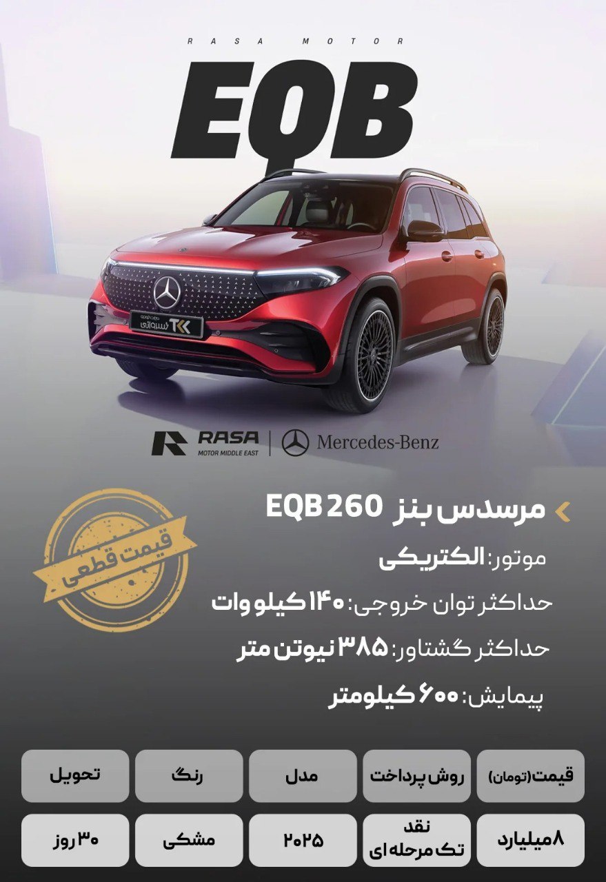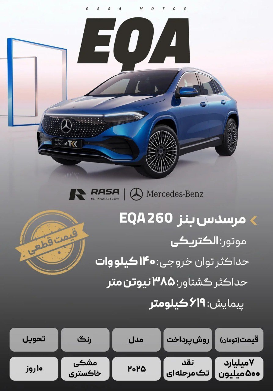 شرکت راسا موتور خاورمیانه در جدیدترین اقدام خود، بخشنامه فروش سه مدل از محصولات تمام الکتریکی مرسدس بنز (Mercedes-Benz EQ Family) را با موعد تحویل‌های کوتاه‌مدت و قیمت قطعی برای آذرماه ۱۴۰۴ منتشر کرده‌است.