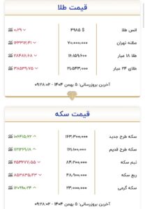 جدول زیر دربردارنده قیمتهای اعلامی از سوی اتحادیه طلا و جواهر و نقره تهران است.