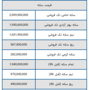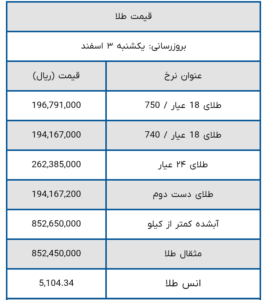 به گزارش صنعت مالی، قیمت سکه و قیمت طلا امروز یکشنبه ۳ اسفند ۱۴۰۴ را در جدول زیر مشاهده کنید. علاوه بر قیمت سکه امامی، بهار آزادی، گرمی، نیم سکه و ربع سکه میتوانید قیمت مثقال و انس جهانی طلا، طلای آبشده و دست دوم را نیز مشاهده فرمایید.