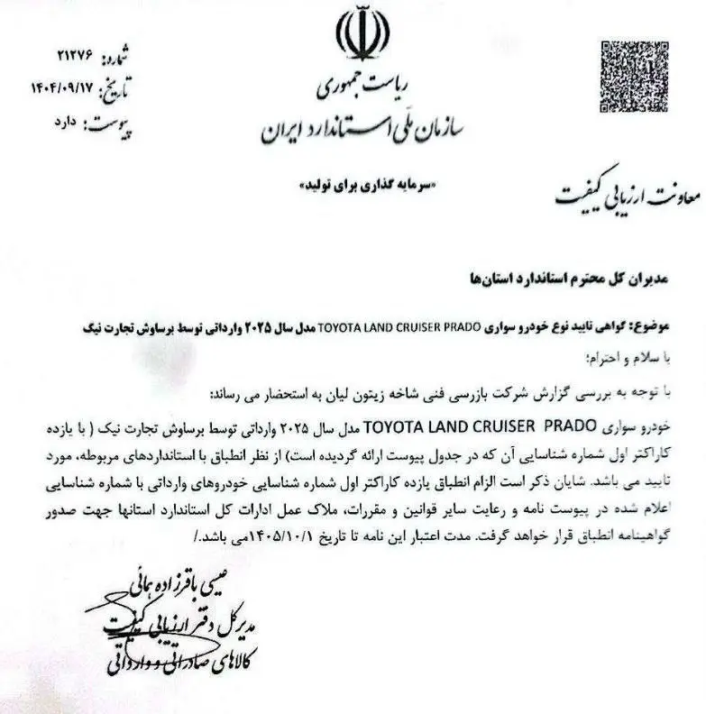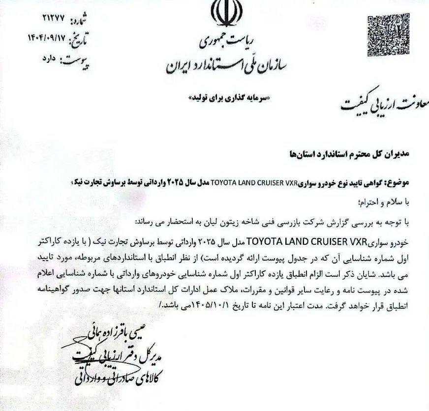 بر اساس اسناد منتشر شده که به تاریخ ۱۷ آذر ۱۴۰۴ (۸ دسامبر ۲۰۲۵) اشاره دارد، معاونت ارزیابی کیفیت این سازمان، گواهی تایید نوع (Type Approval) را برای خودروهای تویوتا لندکروزر VXR و تویوتا لندکروزر پرادو مدل ۲۰۲۵ صادر کرده است.