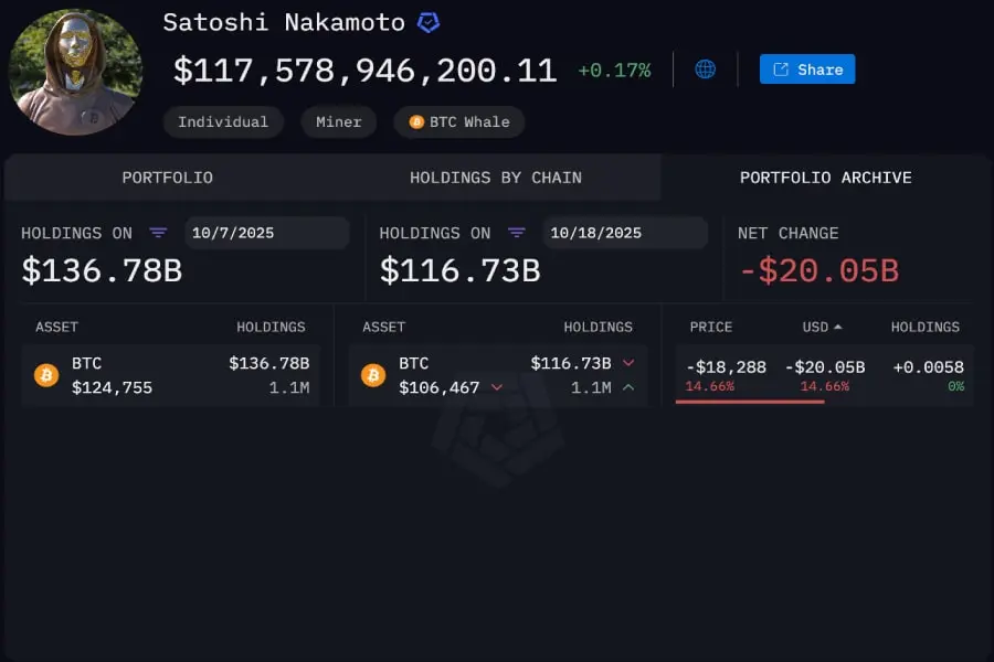 بر اساس داده‌های منتشرشده از سوی پلتفرم تحلیلی آرخام، دارایی‌های موجود در کیف‌پول‌های منسوب به ساتوشی، طی هفته‌های اخیر افت چشمگیری را تجربه کرده‌اند. ارزش این دارایی‌ها که در اوایل اکتبر به سقف تاریخی بیش از ۱۲۶ میلیارد دلار رسیده بود، اکنون بیش از ۲۰ میلیارد دلار کاهش یافته است. چنین افتی نه‌تنها زنگ خطر تازه‌ای برای فعالان بازار به‌صدا درآورده، بلکه موجی از گمانه‌زنی‌ها درباره آینده کوتاه‌مدت بازار کریپتو را نیز برانگیخته است.
