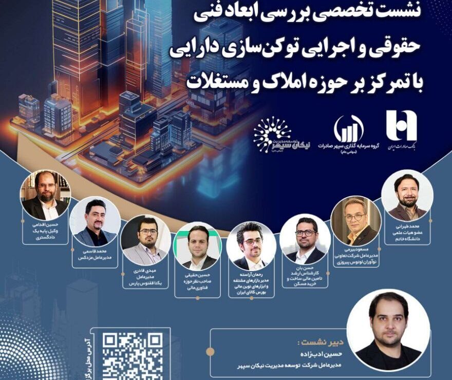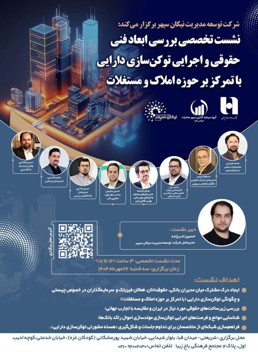 نشست تخصصی «بررسی ابعاد فنی، حقوق و اجرایی توکنسازی دارایی با تمرکز بر حوزه املاک و مستغلات» روز سهشنبه ۲۲ مهرماه ۱۴۰۴ به همت شرکت توسعه مدیریت نیکان سپهر و با حضور جمعی از کارشناسان و مدیران حقوقی و فناوری در تهران برگزار میشود.