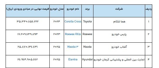 -کلیه قیمتهای مندرج در جدول، قیمت در مبادی ورودی کشور بوده و هزینههای بعد از ترخیص شامل بیمه شخص ثالث، شمارهگذاری، مالیات بر ارزش افزوده، عوارض قانونی، اسقاط خودروی فرسوده، کرایه حمل و… به قیمتهای مذکور اضافه میشود.