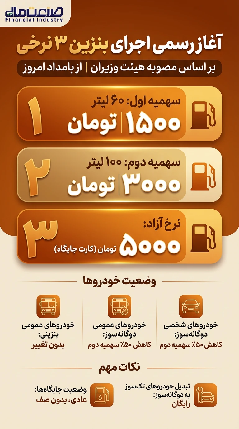 به گزارش صنعت مالی، از ساعت صفر بامداد امروز، مصوبه هیئت وزیران مبنی بر سه نرخی شدن بنزین رسماً اجرایی شد. وضعیت جایگاهها عادی گزارش شده و جزئیات نرخها و سهمیهها به شرح زیر است: