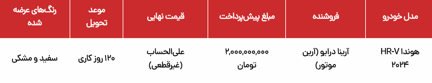 آرینا درایو، فروش هوندا HR-V را با شرایط خاص مالی و پیشپرداخت کلان راهاندازی کرد.