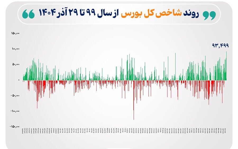 بالاترین رقم رشد شاخص در تاریخ بورس تهران امروز شنبه ۲۹ آذر ۱۴۰۴ رقم خورد. شاخص کل بورس تهران در مبادلات امروز ۹۳ هزار واحد رشد کرد.