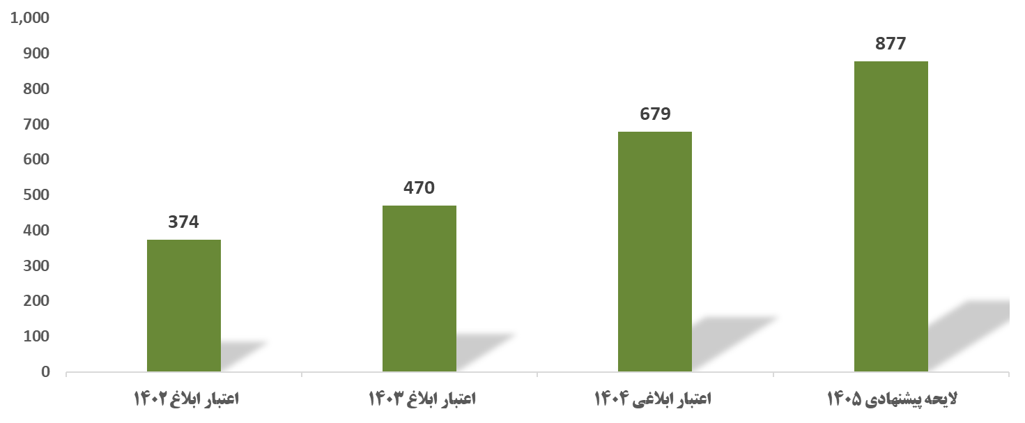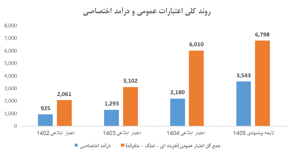 در بخش جمع کل اعتبارات عمومی شامل هزینه ای، تملک دارایی و متفرقه نیز از عدد ۲ هزار و ۶۱ میلیارد ریال در سال ۱۴۰۲ به سه هزار و ۱۰۲ میلیارد ریال در سال ۱۴۰۳ و نیز ۶ هزار و ۱۰ میلیارد ریال اعتبار ابلاغ شده در سال ۱۴۰۴ رسیده که این رقم در بودجه سال ۱۴۰۵ با ۱۳ درصد رشد به ۶ هزار و ۷۸۹ میلیارد ریال می رسد.