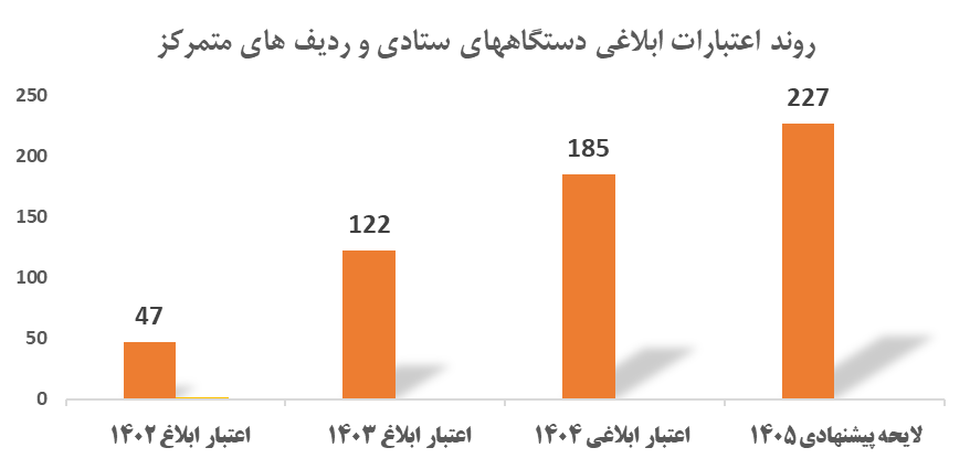 اعتبارات دستگاههای ستادی و ردیفهای متمرکز از ۱۸۵ میلیارد ریال سال ۱۴۰۴ با رشد ۲۳ درصدی به ۲۲۷ میلیارد ریال در لایحه بودجه ۱۴۰۵ رسیده است.