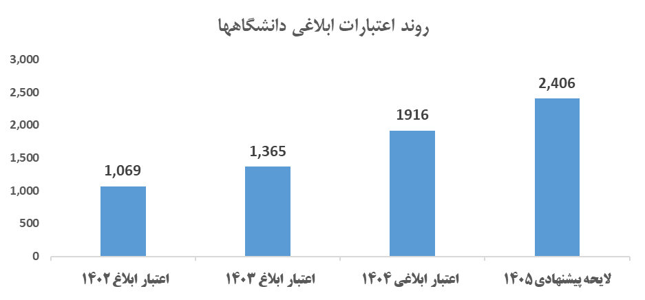 بر اساس لایحه سال ۱۴۰۵، اعتبار حقوق (بند واو) دانشگاه ها با احتساب ردیف های متفرقه، ۲۶ درصد رشد خواهد داشت، با لحاظ ۱.۸ هزار میلیارد تومان جهت استخدام های جدید مربوط به سال ۱۴۰۵ و ۲ همت جهت جبران هزینه های متعهدین خدمت (برای نخستین بار).