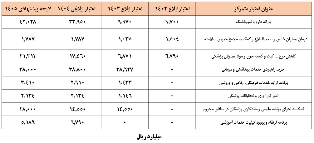 در لایحه پیشنهادی بودجه سال ۱۴۰۵، اعتبارات قابل توجهی برای ردیفهای متمرکز بخش سلامت در نظر گرفته شده که نسبت به سالهای گذشته با رشد چشمگیر همراه بوده است. مهمترین جزئیات به شرح زیر است: