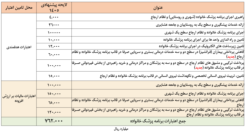بر اساس جداول بخش اعتبارات برنامه پزشک خانواده و نظام ارجاع در لایحه بودجه سال ۱۴۰۵، مجموع منابع پیشبینیشده برای اجرای این برنامه به ۷۶۲ هزار میلیارد ریال رسیده است. این اعتبارات از ۲ محل اصلی «اعتبارات هدفمندی» و «اعتبارات مالیات بر ارزش افزوده» تأمین میشود و بخشهای مختلف زنجیره ارائه خدمات سلامت را از سطح پیشگیری تا درمان پوشش میدهد.
