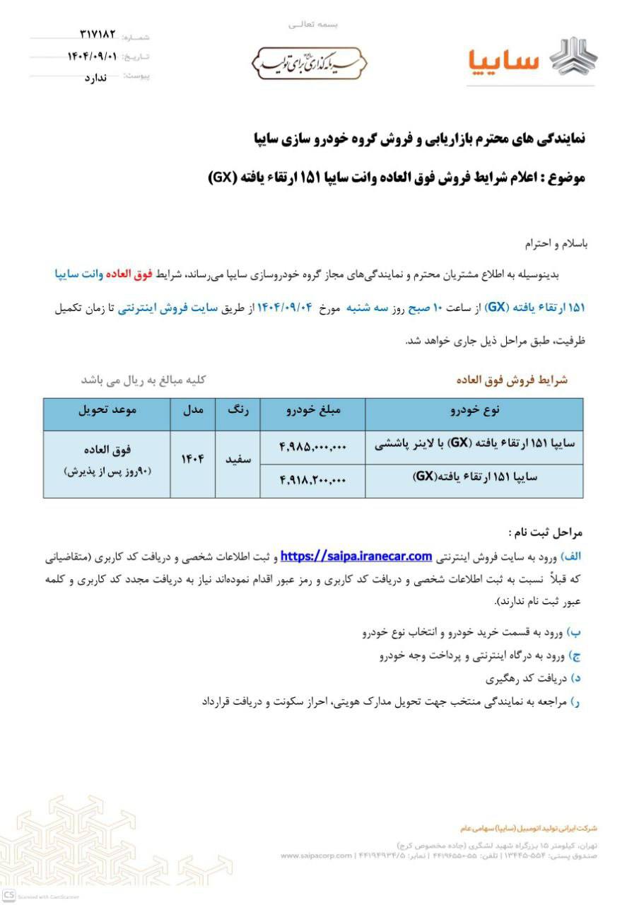به گزارش صنعت مالی، شرکت خودروسازی سایپا به اطلاع مشتریان محترم و نمایندگی هاي مجاز میرساند، فروش فوق العاده وانت سایپا 151 ارتقاء یافته (GX) از ساعت 10 صبح روز سه شنبه مورخ 1404/09/04 از طریق سایت فروش اینترنتی تا زمان تکمیل ظرفیت، طبق مراحل مندرج در بخشنامه آغاز خواهد شد.