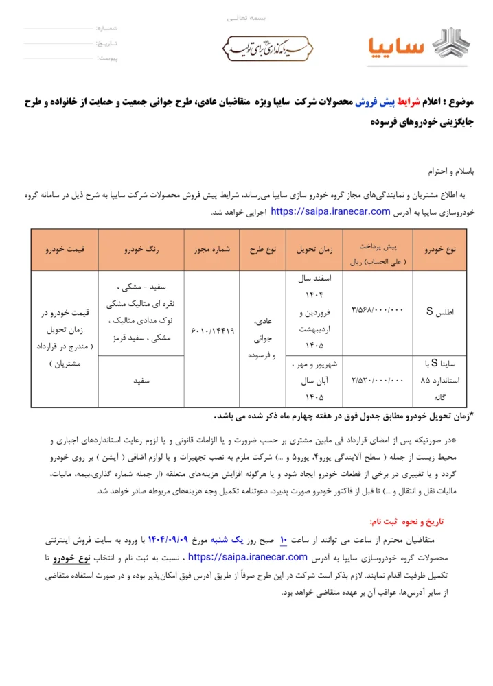 متقاضیان می توانند از ساعت ۱۰ روز یکشنبه ۹ آذر تا زمان تکمیل ظرفیت با مراجعه به سایت فروش سایپا نسبت به ثبت نام قرعه کشی این دو خودرو اقدام نمایند.