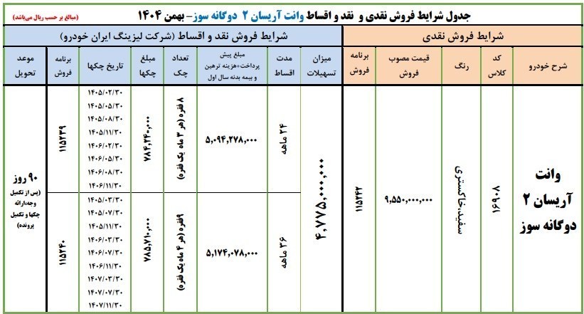 به گزارش صنعت مالی، ایران خودرو به منظور تامین نیاز مصرف کنندگان واقعی، محصول وانت آریسان 2 دوگانه سوز، بدون کنترل پلاک فعال و ثبت نام های قبلی، متمم بخشنامه 4980 با تغییر موعد تحویل حداکثر 90 روزه با شرایط جدول ذیل و از طریق شبکه نمایندگی ها ارائه می‌کند: