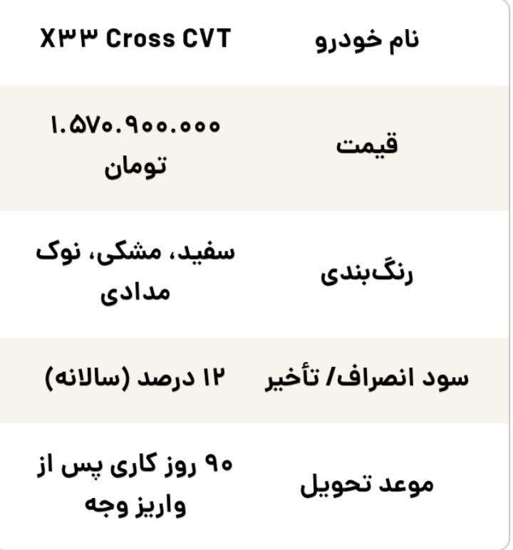 مدیرانخودرو در اطلاعیهای شرایط فروش امویام X۳۳ کراس را با قیمت یک میلیارد و ۵۷۰ میلیون تومان اعلام کرد.