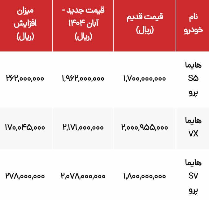 قیمت جدید محصولات هایما ویژه آذر ماه اعلام شد