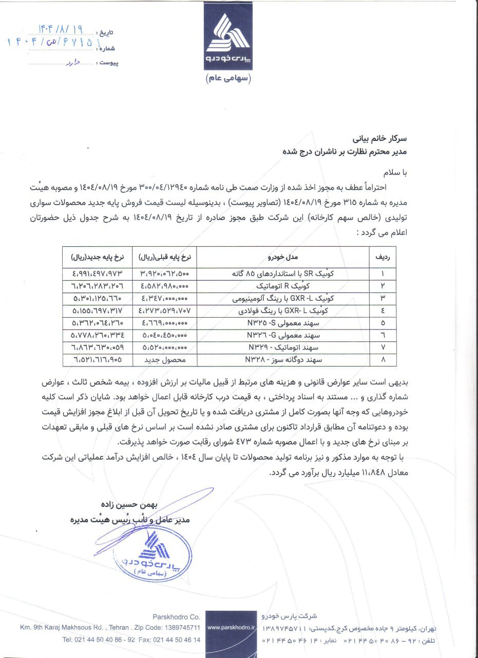 افزایش قیمت محصولات پارس خودرو رسما اعلام شد.