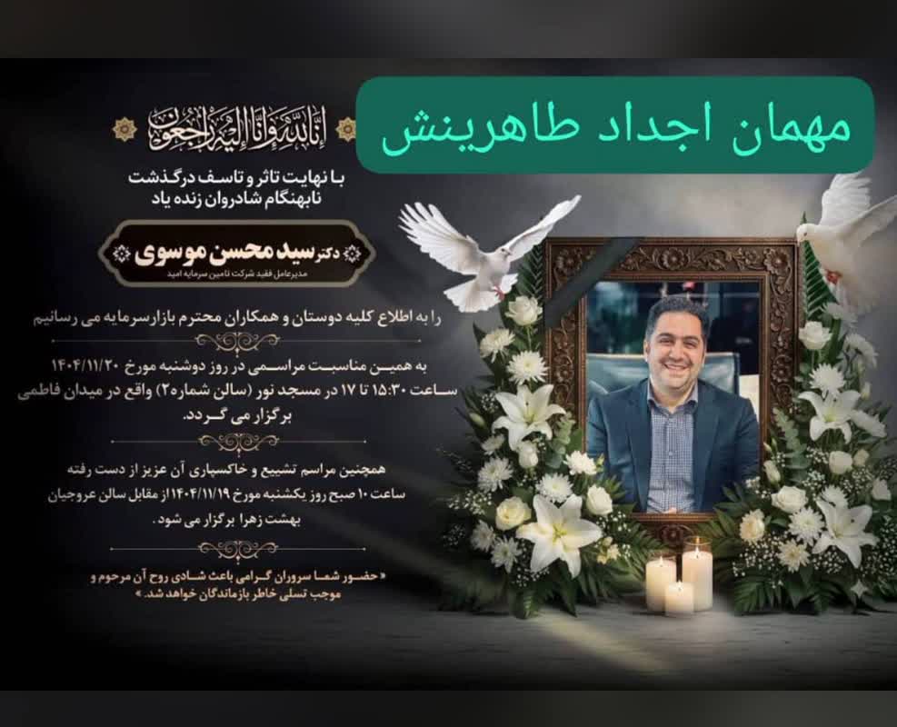 پیکر دکتر سید محسن موسوی، مدیرعامل فقید شرکت تأمین سرمایه امید، صبح روز یکشنبه ۱۹ بهمن تشییع خواهد شد.