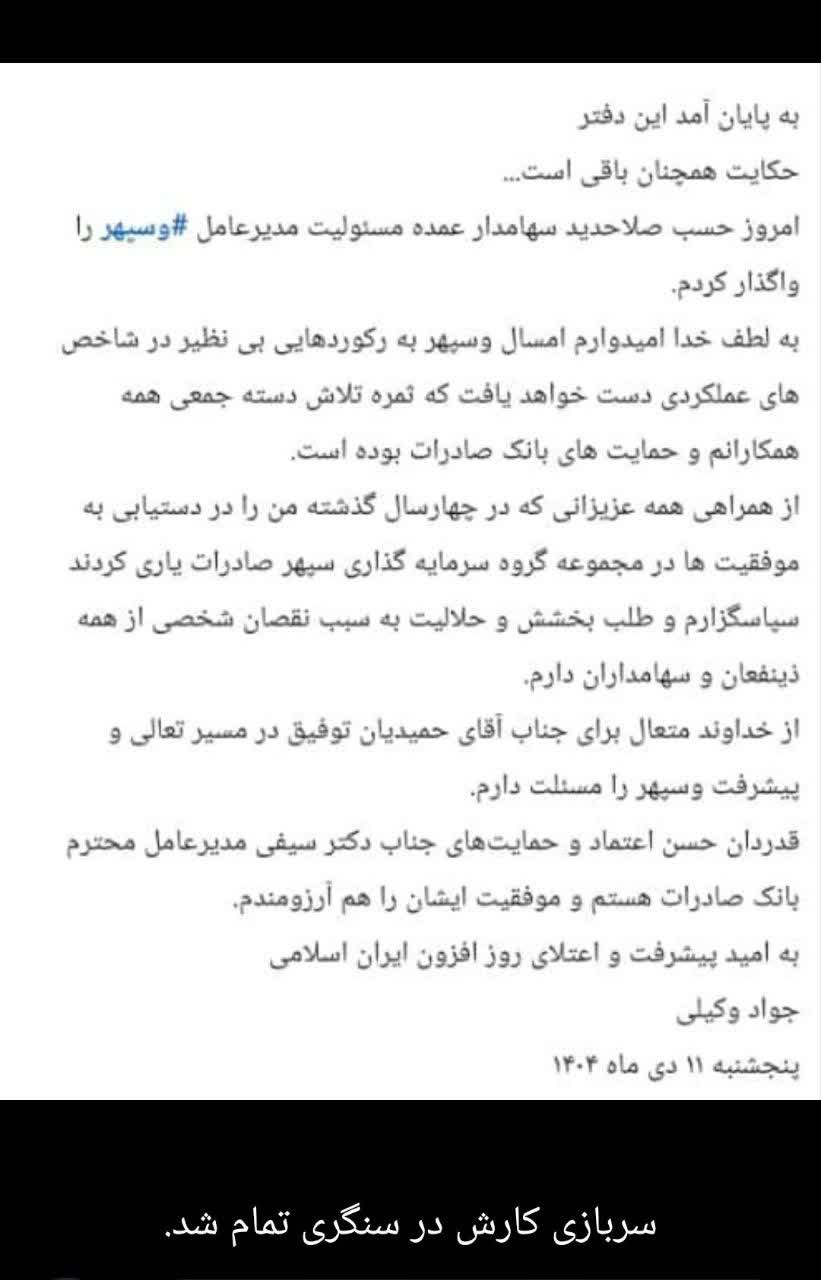 به گزارش صنعت مالی، در تحولی مدیریتی در یکی از مجموعههای اقتصادی کشور، جواد وکیلی با انتشار پیامی در فضای مجازی از هلدینگ وسپهر خداحافظی کرد.