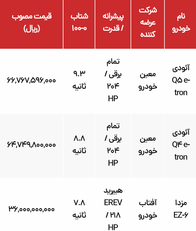 سامانه اتونوین فروش سه خودروی برقی وارداتی از برندهای آئودی و مزدا را با تحویل ۹۰ تا ۱۲۰ روزه و شرایط پرداخت ویژه آغاز کرد.