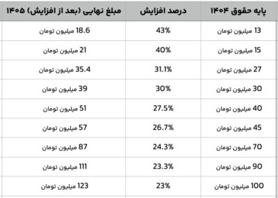 به گزارش صنعت مالی، بر اساس آخرین مصوبه تعیین حقوق در سال ۱۴۰۵، افزایش حقوق کارمندان و کارگران به صورت پلکانی و بر اساس پایه حقوق سال قبل تعیین شده است.